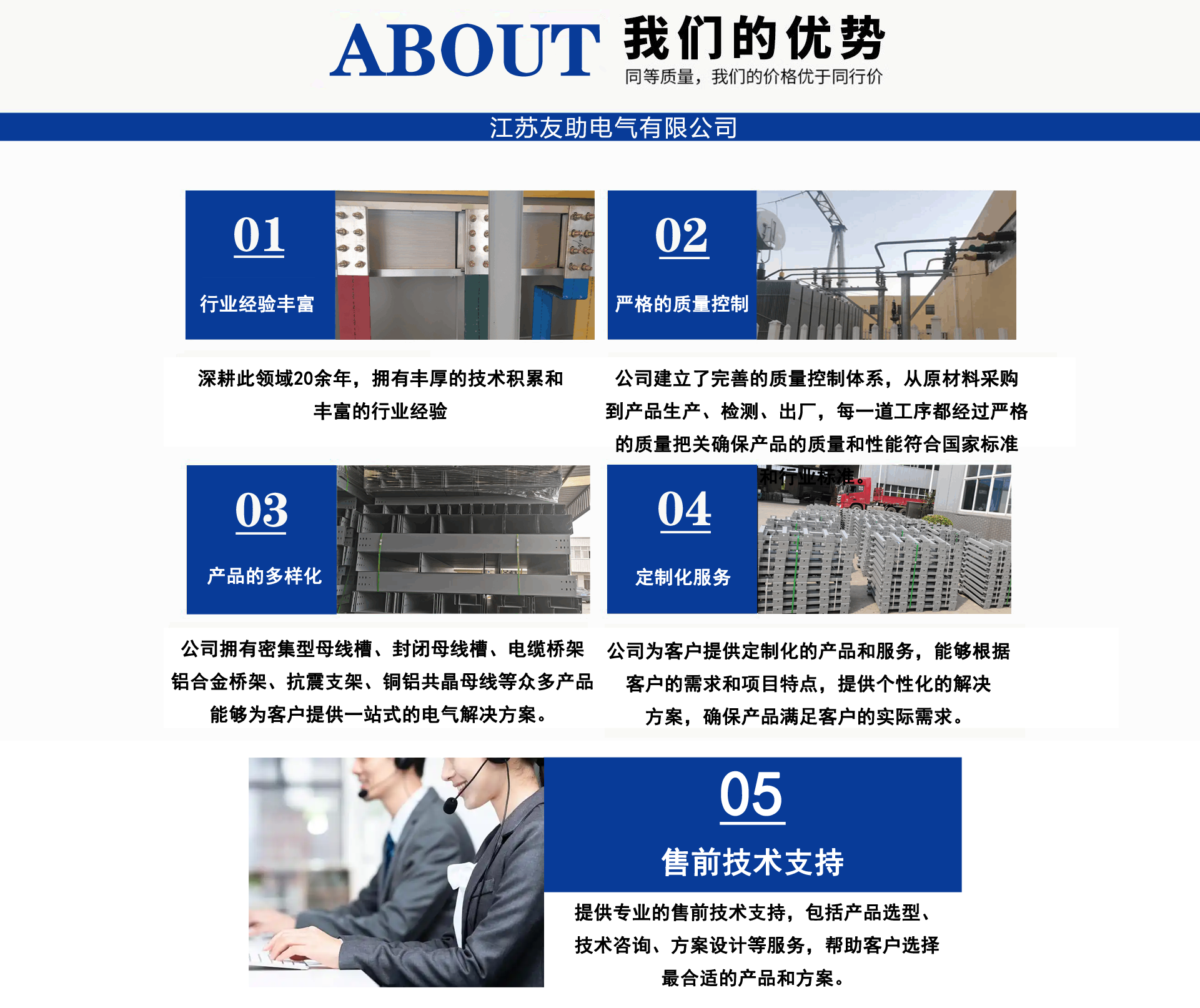 江蘇友助電氣有限公司地處中國(guó)工程電氣生產(chǎn)基地-一江蘇省揚(yáng)中市。經(jīng)營(yíng)范圍:電纜橋架,母線槽(橋),管型母線,銅軟連接(伸縮節(jié)),高低壓開(kāi)關(guān)柜,配電箱,抗震支架產(chǎn)品系列。 公司宗旨:客戶至上。已成功為江蘇二十屆省運(yùn)會(huì)會(huì)場(chǎng)-泰州體育館,南京寶龍商業(yè)綜合體,張家口百兆瓦風(fēng)電場(chǎng),濟(jì)源市婦幼醫(yī)院,威海市未來(lái)科技園,湖北皇恩燁新材料科技有限公司,南京中央路小學(xué),南通中天大酒店,新疆新安特鋼有限公司,河北省送變電有限公司,南京南微醫(yī)學(xué)研發(fā)基地等多項(xiàng)工程配套服務(wù),我們?cè)概c您精誠(chéng)合作,互利共贏!公司技術(shù)人員深耕橋架,母線領(lǐng)域30年,為您提供橋架,母線槽疑難問(wèn)題解決方案。母線槽不論每相是單排,雙排,三根排重疊,不管有多少個(gè)水平彎、垂直彎,轉(zhuǎn)接排在發(fā)貨前預(yù)裝一遍,確保尺寸無(wú)誤。到現(xiàn)場(chǎng)直接擰螺絲,效率高,橫平豎直,規(guī)規(guī)矩矩,符合標(biāo)準(zhǔn),供電局,業(yè)主,監(jiān)理,驗(yàn)收易通過(guò)。供貨周期3-7天。為了讓尊貴客戶您,設(shè)備安全通電,高枕無(wú)憂。我們提供如下售前售中售后服務(wù): 售前:免費(fèi)技術(shù)支持,咨詢。 售中:免費(fèi)現(xiàn)場(chǎng)精確測(cè)繪、設(shè)計(jì)。 售后:安裝服務(wù),免費(fèi)指導(dǎo)?!≠|(zhì)量是生命,客戶是源泉。承諾客戶的,一定全力做到。讓我們一起進(jìn)步!...